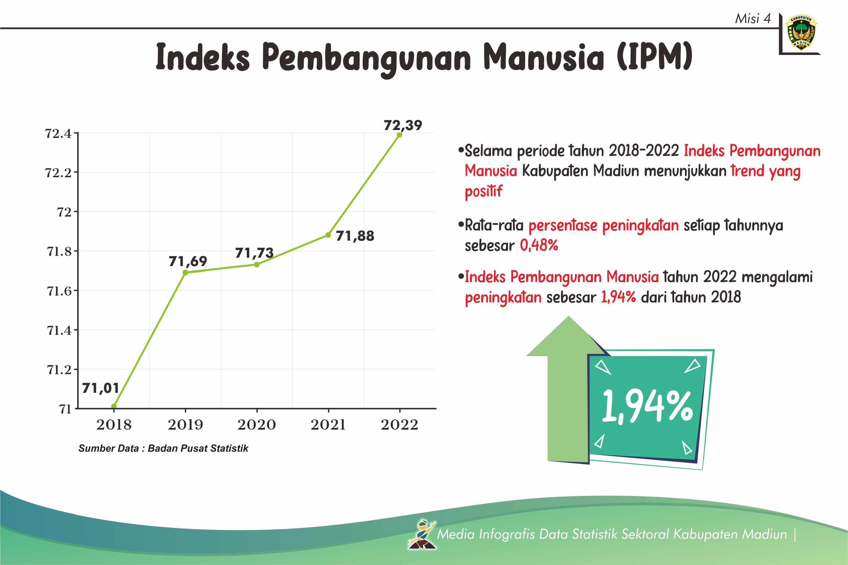 Dari tabel di atas terlihat Indeks Pembangunan Manusia (IPM) Kabupaten Madiun juga mengalami kenaikan pada setiap tahunnya. Namun, pada kurun waktu 3 tahun terakhir IPM mengalami perlambatan terutama tahun 2020. Pandemi COVID-19 telah membawa sedikit perubahan dalam pencapaian pembangunan manusia di Kabupaten Madiun. IPM Kabupaten Madiun tahun 2020 tercatat sebesar 71,73 atau hanya tumbuh 0,06%, melambat dibandingkan pertumbuhan tahun sebelumnya, sama halnya dengan tahun 2021 IPM Kabupaten Madiun tumbuh sebesar 0,21%. Tetapi pada tahun 2022 dengan keadaan penyebaran covid yang sudah terkendali dan kegiatan ekonomi mulai berjalan seperti biasa, IPM Kabupaten Madiun mengalami pertumbuhan yang lebih cepat pada tahun 2022 jika dibandingkan tahun 2020 dan 2021 yakni sebesar 0,71%.