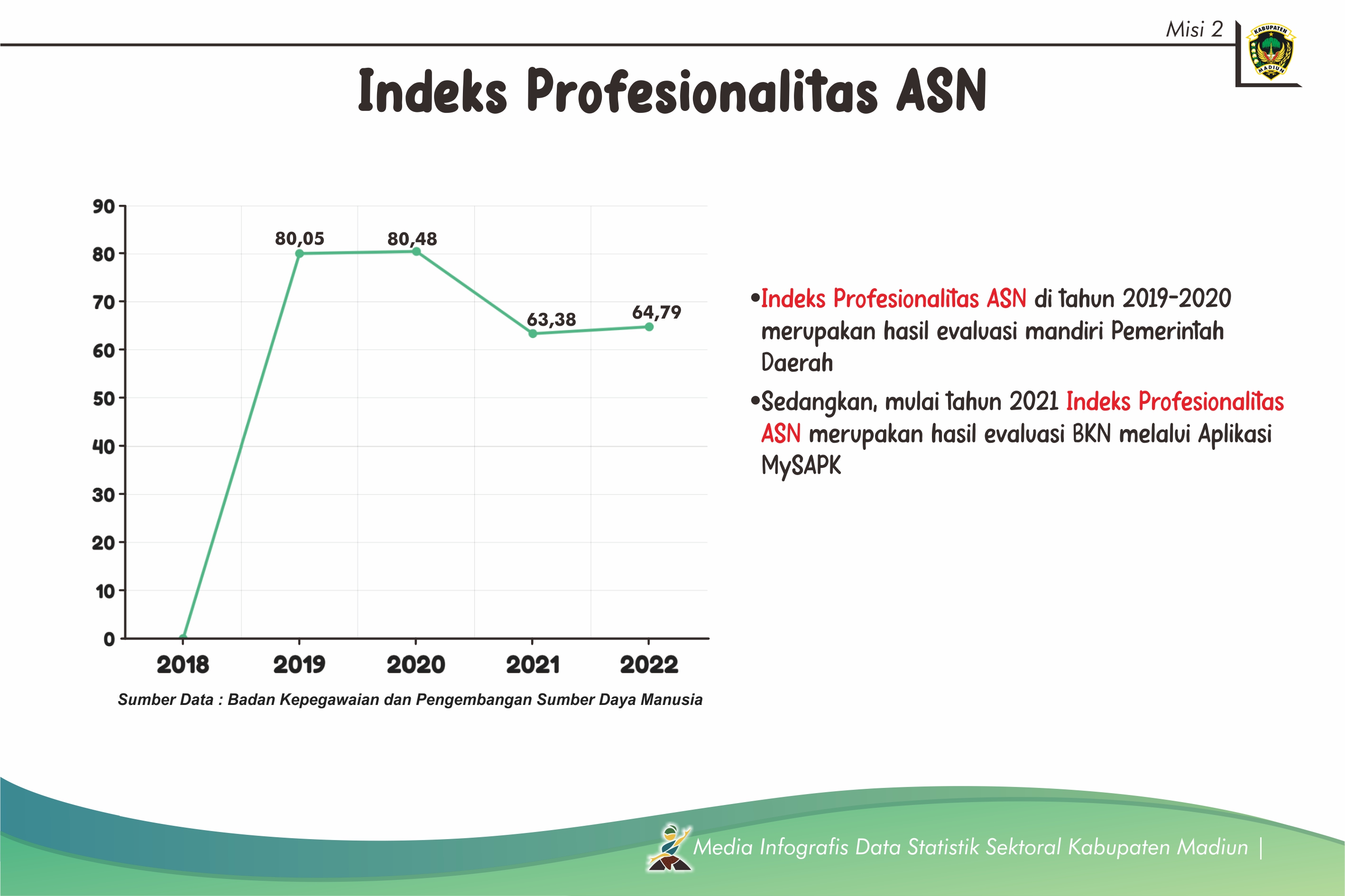Indeks profesionalitas ASN pada tahun 2022 mengalami peningkatan dibandingkan tahun 2021. Pada tahun 2020 indeks profesionalitas ASN 80,48 sedangkan tahun 2021 turun drastis menjadi 63,38. Hal ini disebabkan karena adanya perubahan regulasi BKN yang dulu penghitungan di lakukan secara mandiri oleh pemerintah daerah, sejak Oktober 2021 penilaian dilakukan oleh BKN pusat.