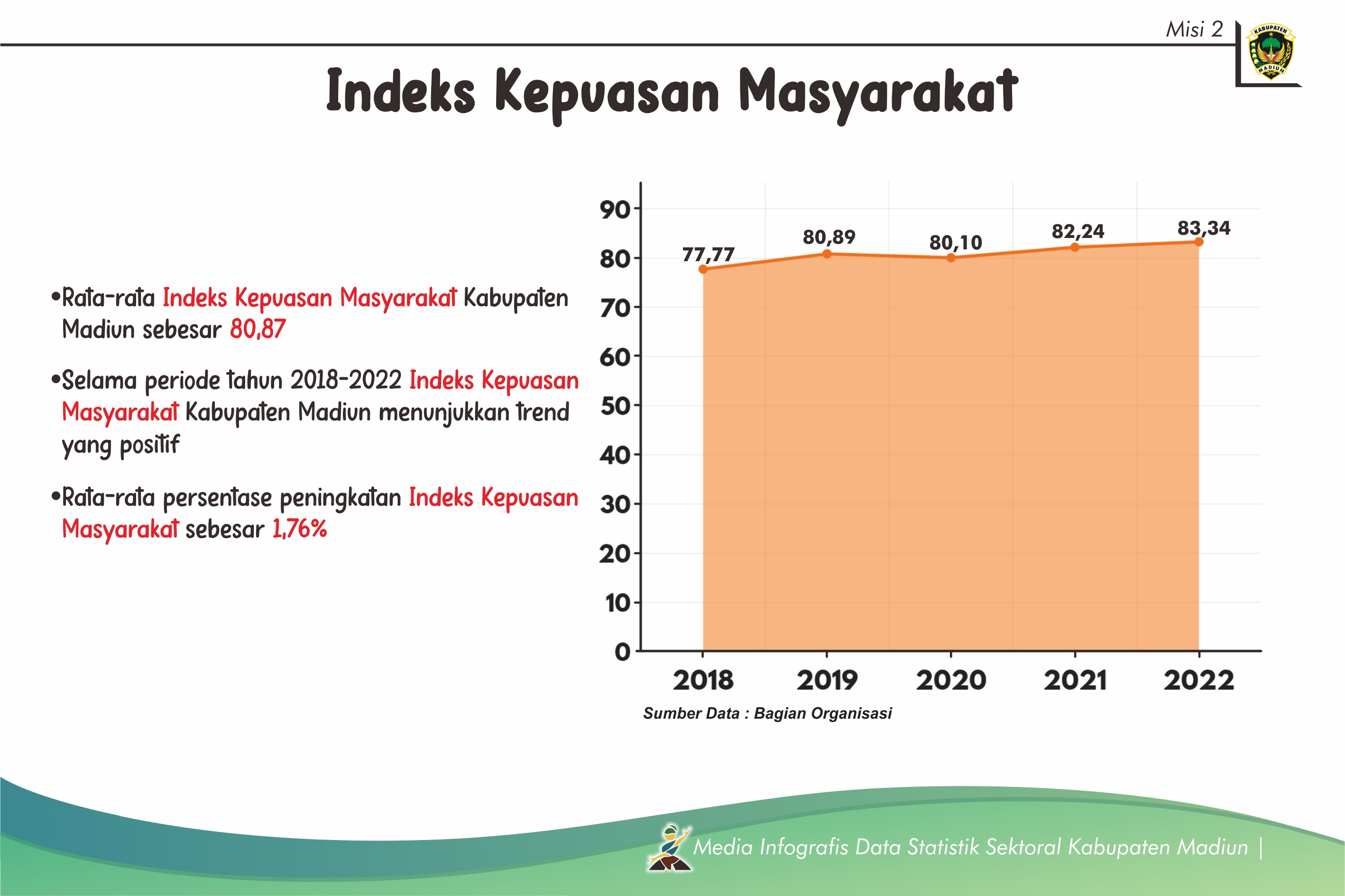 Berdasarkan data di atas diketahui bahwa secara rata-rata Indeks Kepuasan Masyarakat di Kabupaten Madiun sebesar 80,87. Selama periode Tahun 2018-2022 Indeks Kepuasan Masyarakat Kabupaten Madiun menunjukan trend yang positif, yakni dibuktikan dengan terjadinya peningkatan setiap tahunnya. Rata-rata persentase peningkatan Indeks Kepuasan Masyarakat sebesar 1,76%. Namun, secara capaian pada tahun 2022 Indeks Kepuasan Masyarakat belum memenuhi target yang ditetapkan. Hal tersebut perlu dijadikan evaluasi agar pemerintah daerah meningkatkan kualitas pelayanan kepada masyarakat.