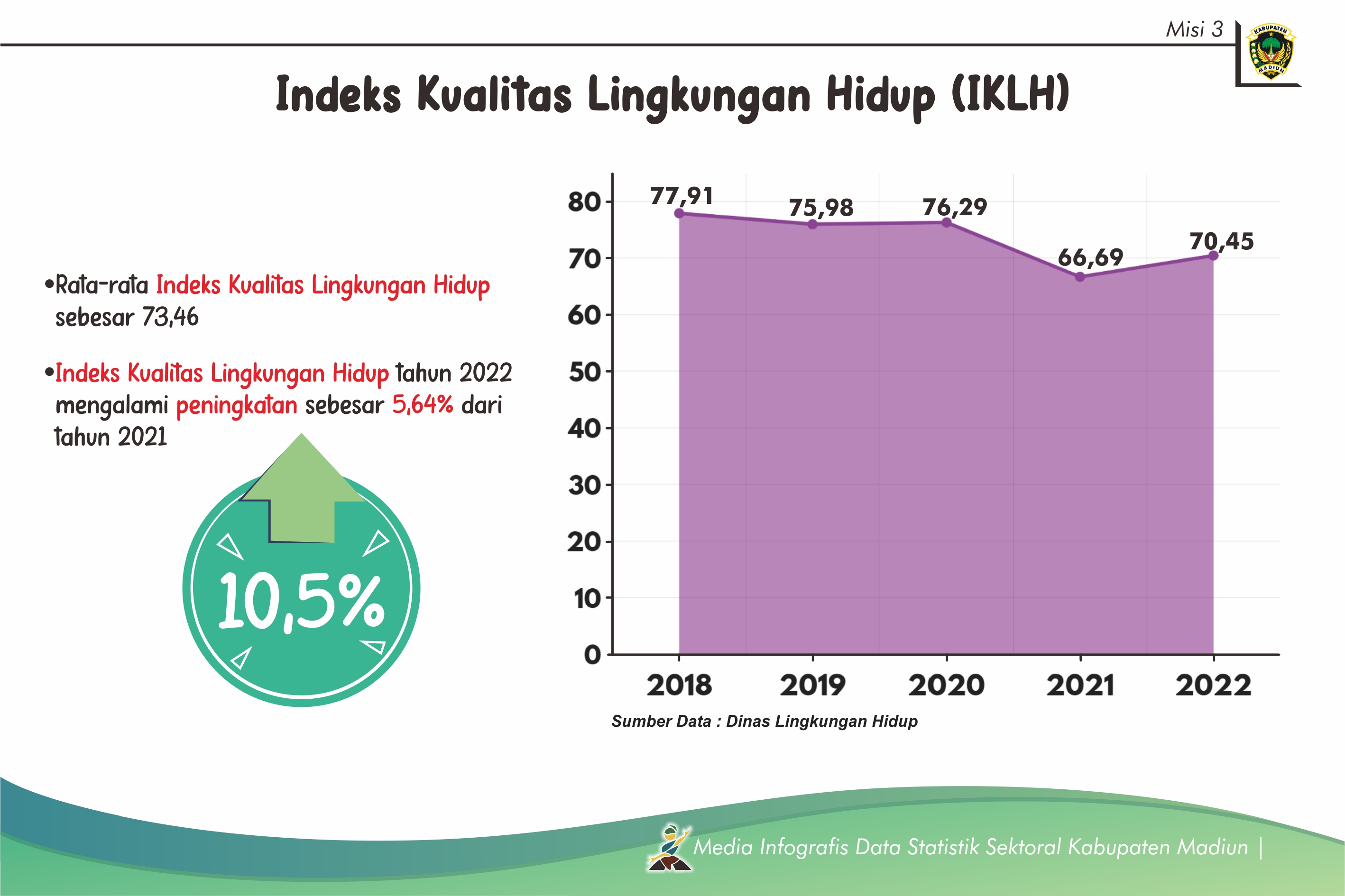 Berdasarkan tabel di atas diketahui bahwa secara rata-rata Indeks Kualitas Lingkungan Hidup sebesar 73,46. Indeks Kualitas Lingkungan Hidup Tahun 2022 mengalami peningkatan sebesar 5,64% dari Tahun 2021. IKLH terbesar terdapat pada tahun 2018 yaitu sebesar 77,91.