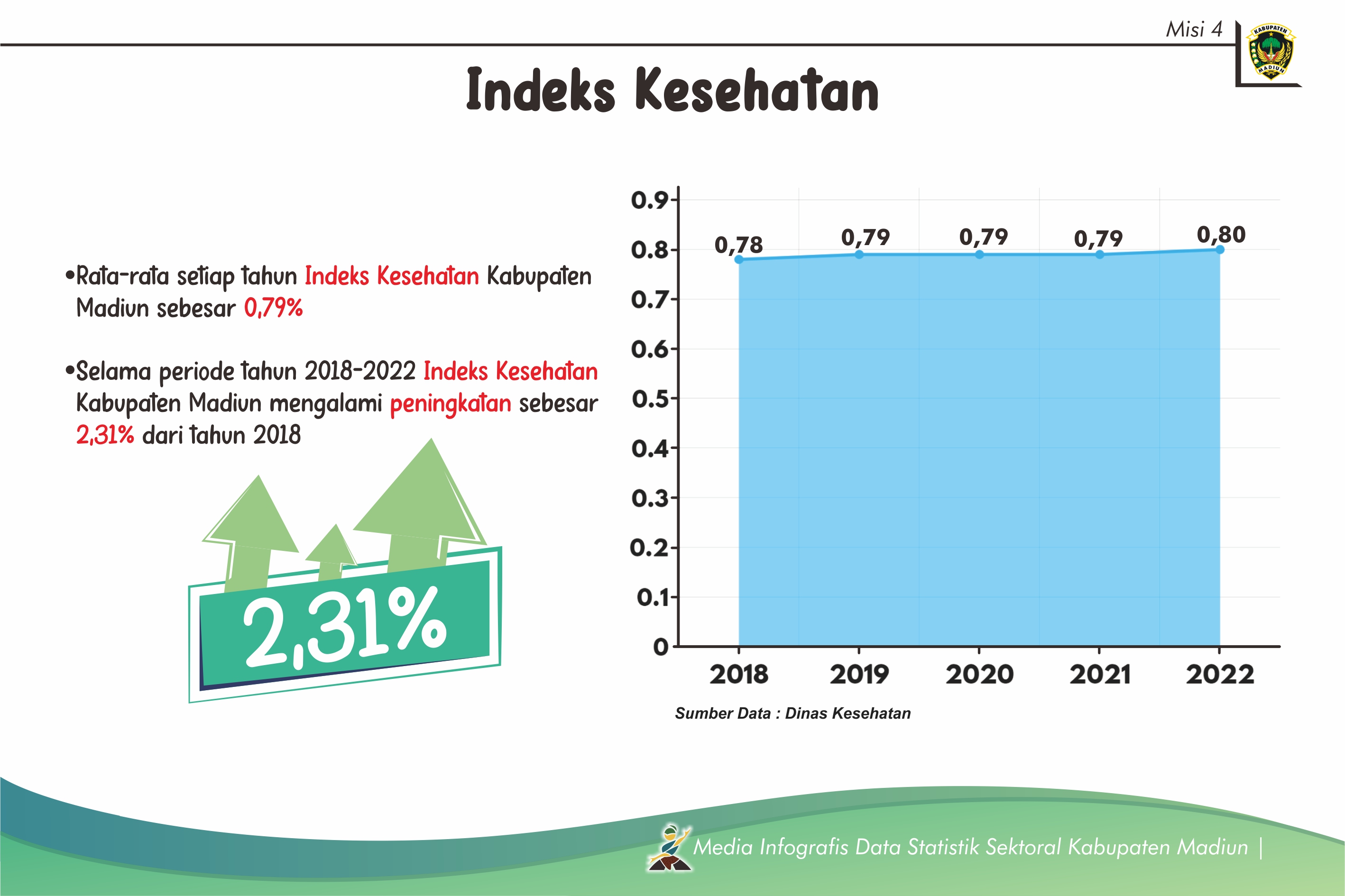 Berdasarkan tabel di atas diketahui bahwa secara rata-rata Indeks Kesehatan di Kabupaten Madiun sebesar 0,79. Selama periode Tahun 2018-2022 Indeks Kesehatan Kabupaten Madiun mengalami peningkatan sebesar 2,31% dari Tahun 2018.