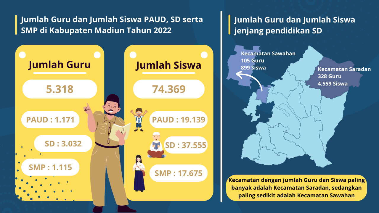 Berdasarkan data yang diperoleh dari Dinas Pendidikan dan Kebudayaan Kabupaten Madiun terkait Jumlah Guru dan Jumlah Siswa menurut Kecamatan Tahun 2022 diketahui bahwa secara jumlah guru terbanyak ada pada jenjang SD yaitu sebesar 3.032 Guru. Jumlah guru SD paling banyak terdapat pada Kecamatan Saradan yaitu sebesar 328 Guru, sedangkan jumlah guru SD paling sedikit ada pada Kecamatan Sawahan yaitu sebesar 105 Guru. Sama halnya dengan guru, secara jumlah siswa terbanyak juga pada jenjang SD yaitu sebesar 37.555 Siswa. Kecamatan Saradan dan Kecamatan Sawahan masing-masing merupakan Kecamtan paling banyak dan paling sedikit dalam hal jumlah siswa yang ada di Kabupaten Madiun masing-masing sebanyak 4.559 Siswa dan 899 Siswa.
